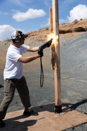 Royal Arms brought their breaching system to the range for us to try. The key is combining frangible breaching ammo, a shotgun with a breaching stand-off device, and good technique. The ammo is composed of a compressed copper or copper and steel frangible slug in various weights to suit the type of door you need to breach. The stand-off device directs energy on target while venting pressure and deflecting debris. It also bites into the door for quick, secure, and accurate placement on target.