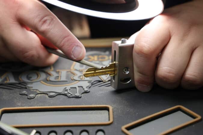 Lockpicking refers to opening a lock without its key. Typically, you’d use special tools, such as lockpicks of varying types and tension wrenches. Using your tools, you manipulate the internals of a lock, like their pins or wafers, to unlock it. Lockpicking is both an art and science.