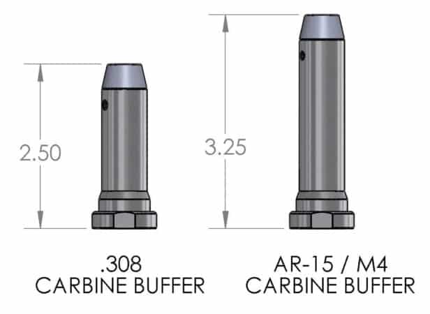 If you have an AR-15 carbine tube on your AR-10, it must be used with a 2.5-inch shorty .308 buffer, since an AR-10 bolt carrier is longer than an AR-15 carrier. If you have an intermediate or A5 length tube, you can use a standard 3.25-inch-long AR-15 carbine buffer.