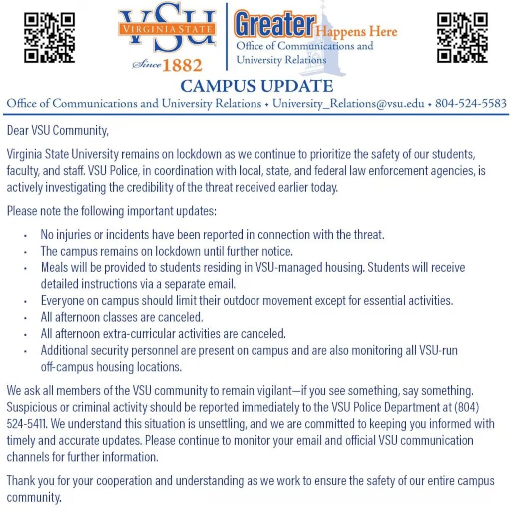 Virginia State University announced its campus would remain locked down as law enforcement at the local, state, and federal levels investigates the credibility of the threat. University officials emphasized that no injuries or incidents have been reported. Additional security has been deployed on and off campus, and all classes and extracurricular activities have been canceled until further notice.