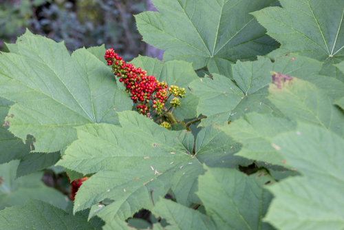 Devil’s club is found only in the Pacific Northwest coastal forests and some parts of the inland Northwest/Great Lakes. It favors wet, dark, old-growth forests, often near streams or swampy ground. It grows in dense thickets. The plant itself is a deciduous shrub, 3 to 9 feet tall, with a few thick stems that branch sparsely.55 56 The most striking features: the stems (and the underside of leaves) are covered in sharp, yellowish spines up to 1/2 inch long.57 These spines are no joke – they will pierce skin easily and break off. The leaves are huge and look like something tropical: they are large, palmate leaves up to 14 inches across, with 7–9 lobes, resembling a giant maple leaf in shape.58 59 The leaves have spines on the veins underneath. In late spring, devil’s club produces clusters of small whitish-green flowers on a spike (like a tall cone or raceme). By late summer, those flowers turn into a cluster of bright red berries – arranged somewhat pyramidally. The berries look tempting but are not edible for humans (birds eat them, but they can cause vomiting in people).60 In winter, the shrub is bare and the devilish spines on naked sticks make it even creepier. Devil’s club often grows intermixed with skunk cabbage and ferns in its native range. If you’re in Southeast Alaska, Western BC, coastal Washington/Oregon or even parts of Idaho/Montana in wet forests, you’ll know it when you see it – a wall of spiny club-like stems with giant leaves that say “Don’t touch!” Once you’re familiar, it has no close lookalike except maybe young maple saplings or thimbleberry. Thimbleberry, however, has soft velvety leaves and no spines (and edible red berries). Rule of thumb: If it’s a big maple-like leaf on a spiny stem in deep shade, it’s devil’s club.
