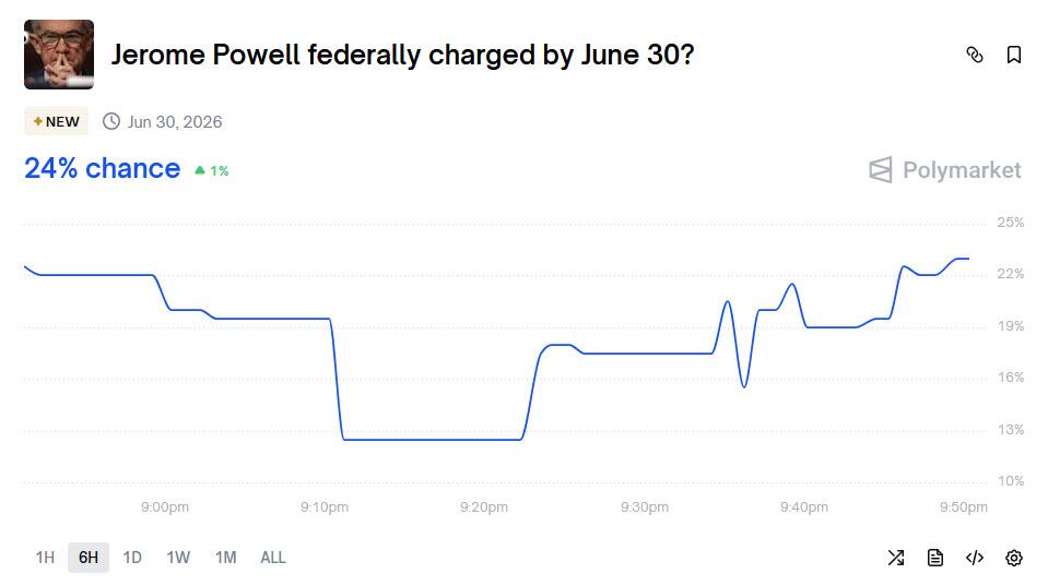Or maybe not, and it’s all for show: according to the latest Polymarket odds, the probability of Powell being federally charged by June 30 – a date that is beyond Powell’s chairman tenure – is only 18%.